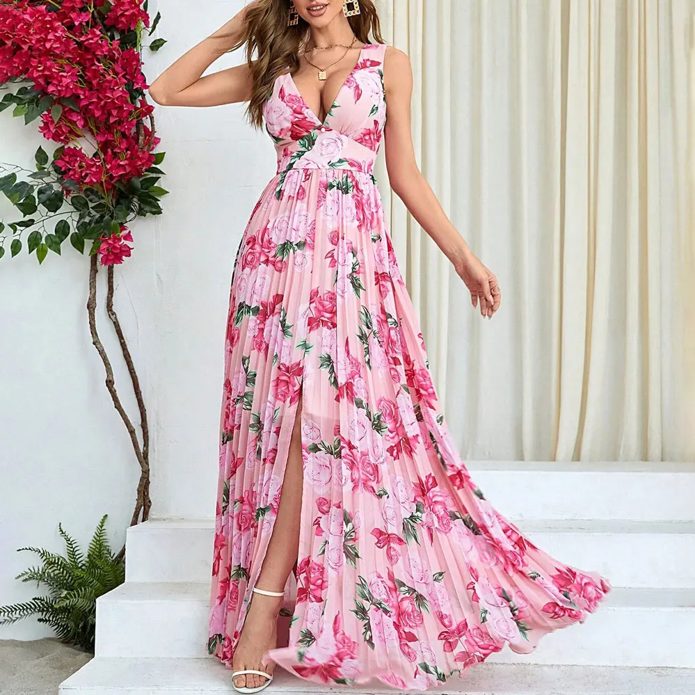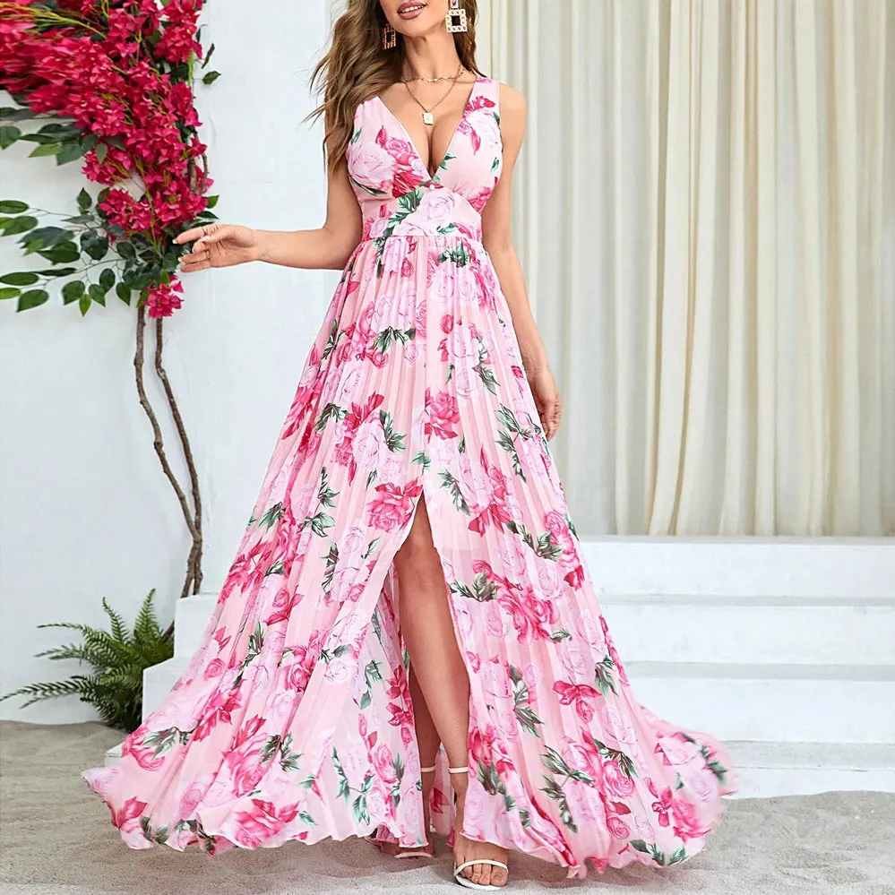 OEM Factory Fashion Beach slip Sleeveless Backless Long Maxi Floral Dress Women Custom logo Print Summer Boho pink Dress